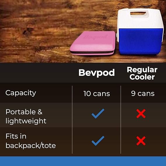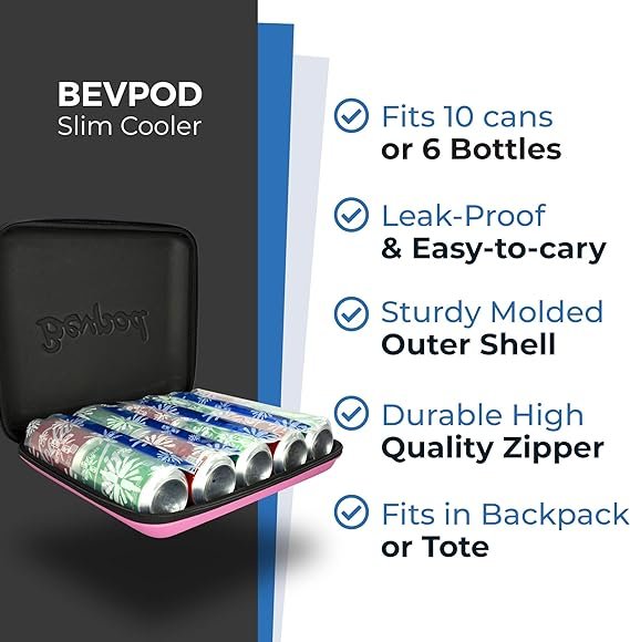 - USE FOR 10 CANS / 6 BOTTLES : The practical small cooler has a hard outer shell and plenty of space inside to hold up to 10 cans or 6 bottles. Your Bevpod cooler is also protected by a leak-proof liner and a sturdy zipper.