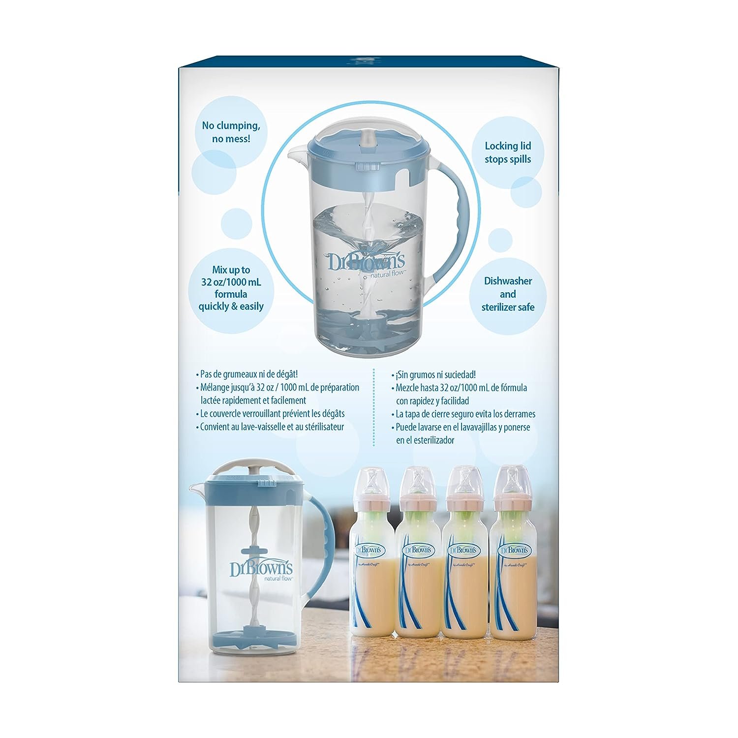 Dr. Brown’s Formula Mixing Pitcher offers fuss-free formula preparation for up to four (4) 8oz/250mL baby bottles at once. The mixing pitcher’s unique blade quickly dissolves and blends up to 32 ounces of formula with no leftover clumping. An adjustable stopper keeps the mixing blade from lifting above the liquid, reducing the amount of air that enters baby’s formula to help minimize air-swallowing during feeding and reduce gas. Available in several stylish colors including Teal, Blue, Olive, Orange and Black. The spill-free locking lid and no-drip spout offer easy and convenient pouring. The Formula Mixing Pitcher is easy to disassemble and dishwasher safe (top rack only).
